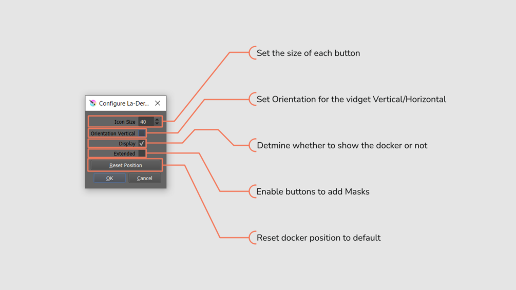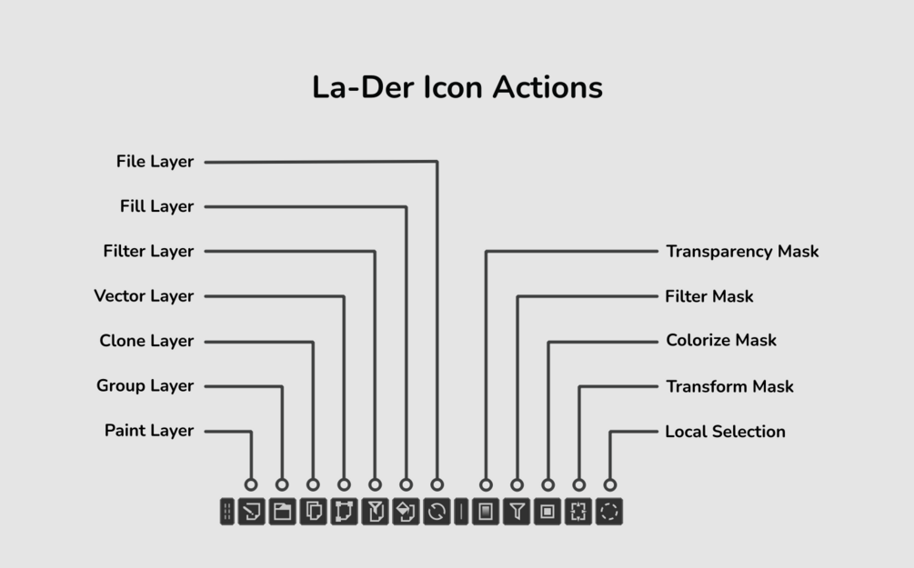 La-Der, shortened layer adder. Is a handy flying docker that allows creating new layers of the following types within one click:
